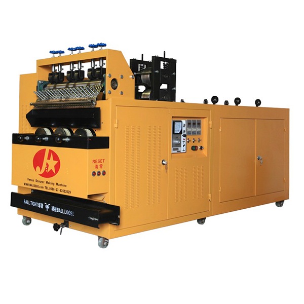 six-wires treble-scourers making machine, is operated by single operator in the processing of wire material feeding, forging pressing,planing,stretching, and Computerized Numerical Controlling scourer ball separation, etc. It has strong stability and fine compatibility.